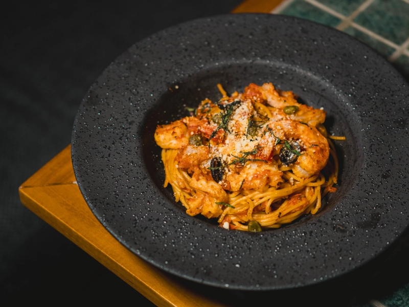 Tomato herbs-based pasta, prawns squid, barramundi, cheese